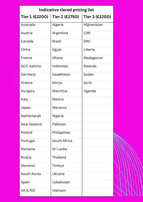 We use a tiered pricing model to make our programmes more accessible globally. Course fees are adjusted based on a learner’s country of residence, ensuring fairer access and greater equity of opportunity. If your country is not listed in the above list, please contact us to determine what payment tier you fit within.